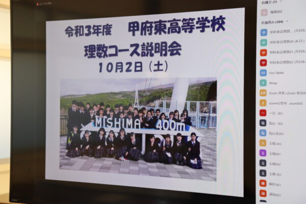山梨県立甲府東高等学校 > 学校行事 > web学校見学会 2021年10月2日カテゴリー: 学校行事 web学校見学会 本日,webにて学校見学会を開催しました。 普通コース約500名,理数コース約110名と多数参加いただきました。