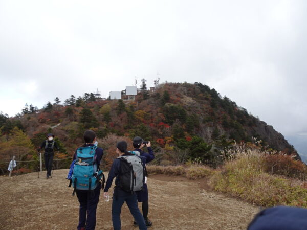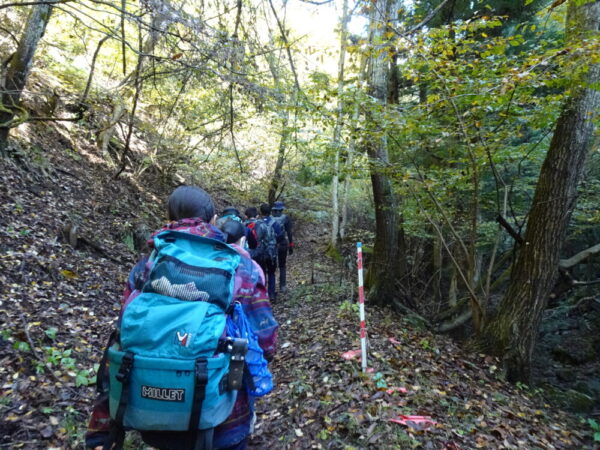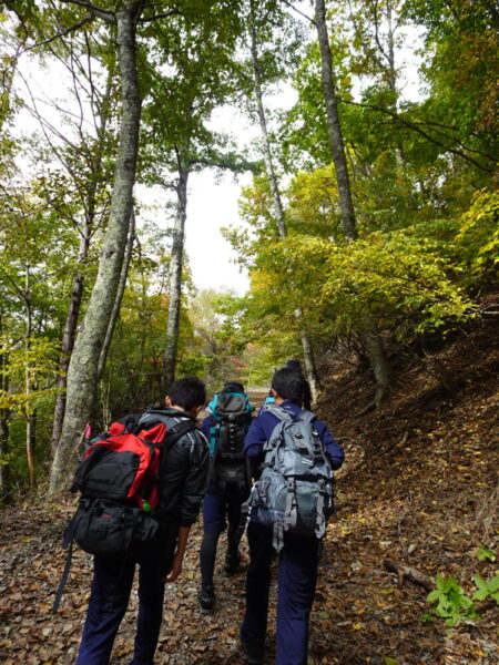 山梨県立甲府東高等学校 > 部活動 > 山岳 > 新人登山大会@三つ峠 2020年10月30日カテゴリー: 部活動 山岳 新人登山大会@三つ峠 10/24(土) 今年度の新人登山大会はコロナウイルスの影響で,みんなで同じ山に登るのではなく各校がそれぞれ登りたい山に登ることになりました。甲府東高校山岳部は三つ峠に登りました。 朝9:40頃,河口浅間神社より行動開始です。 段々と山の中に入っていきます。 途中ポイントの母の白滝に到着。少し休憩をとりました。 標高が高くなるにつれて,まだ黄色の段階ですが紅葉も見られます。 途中にナゾの虫を発見。部員の間では何回見たか数える遊びが始まりました。 登り始めておよそ3時間。ようやく三つ峠山頂(1785m)に到着。 あいにく頂上では雲が多く,富士山は見えませんでした。 お昼休憩。頂上で食べるご飯は美味しいけれど少し寒かったです。(気温9℃) その後は無事に下山しました。今年度初めての公式大会でしたが,全員元気に登ることができました。
