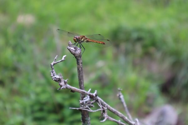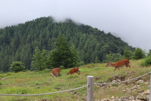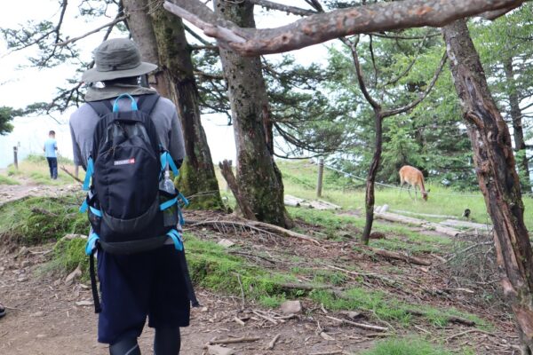 雷岩での休憩中に野生の鹿に遭遇。草を食んでいて、のどかな様子でした。